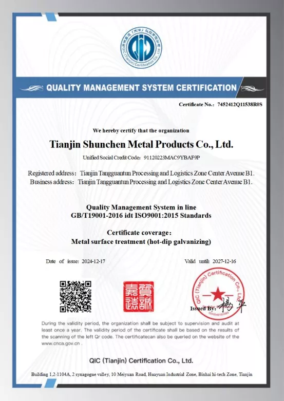 Valige usaldusväärse kvaliteedi tagamiseks Shunchen. Kasutame kvaliteetset Q235B või Q355B terast, mis on korrosioonikindluse tagamiseks töödeldud kuumtsinkimisega. Tsinkpoti temperatuuri reguleeritakse täpselt vahemikus 450-460 kraadi Celsiuse järgi, et tagada tsinkkatte tugev nakkumine ja puuduvate kohtade puudumine. Meie tooted vastavad ISO9001 kvaliteedisüsteemi sertifikaadile ja neid toetavad kolmanda osapoole tsinkkatte kontrollimise aruanded.